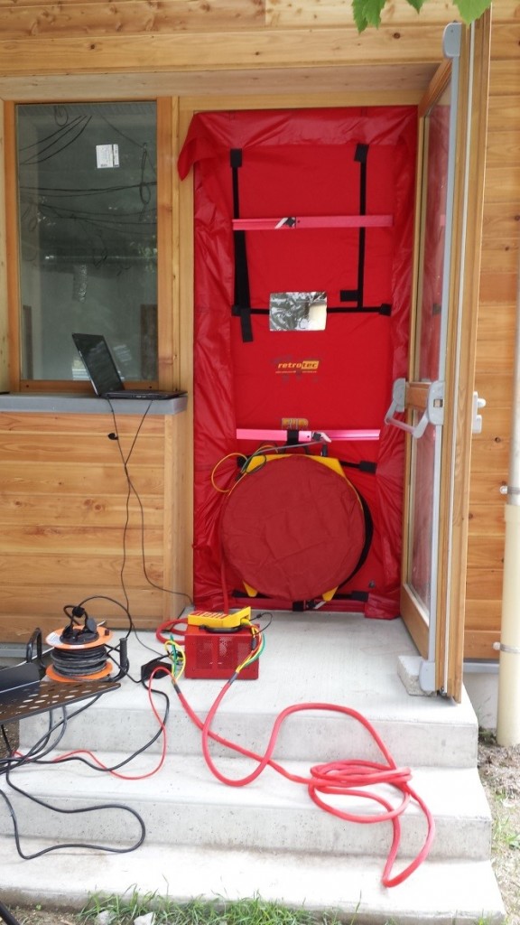 au moyen d’un appareil de mesure (porte soufflante) type Blower Door dans le cadre de la sollicitation du label BBC Effinergie